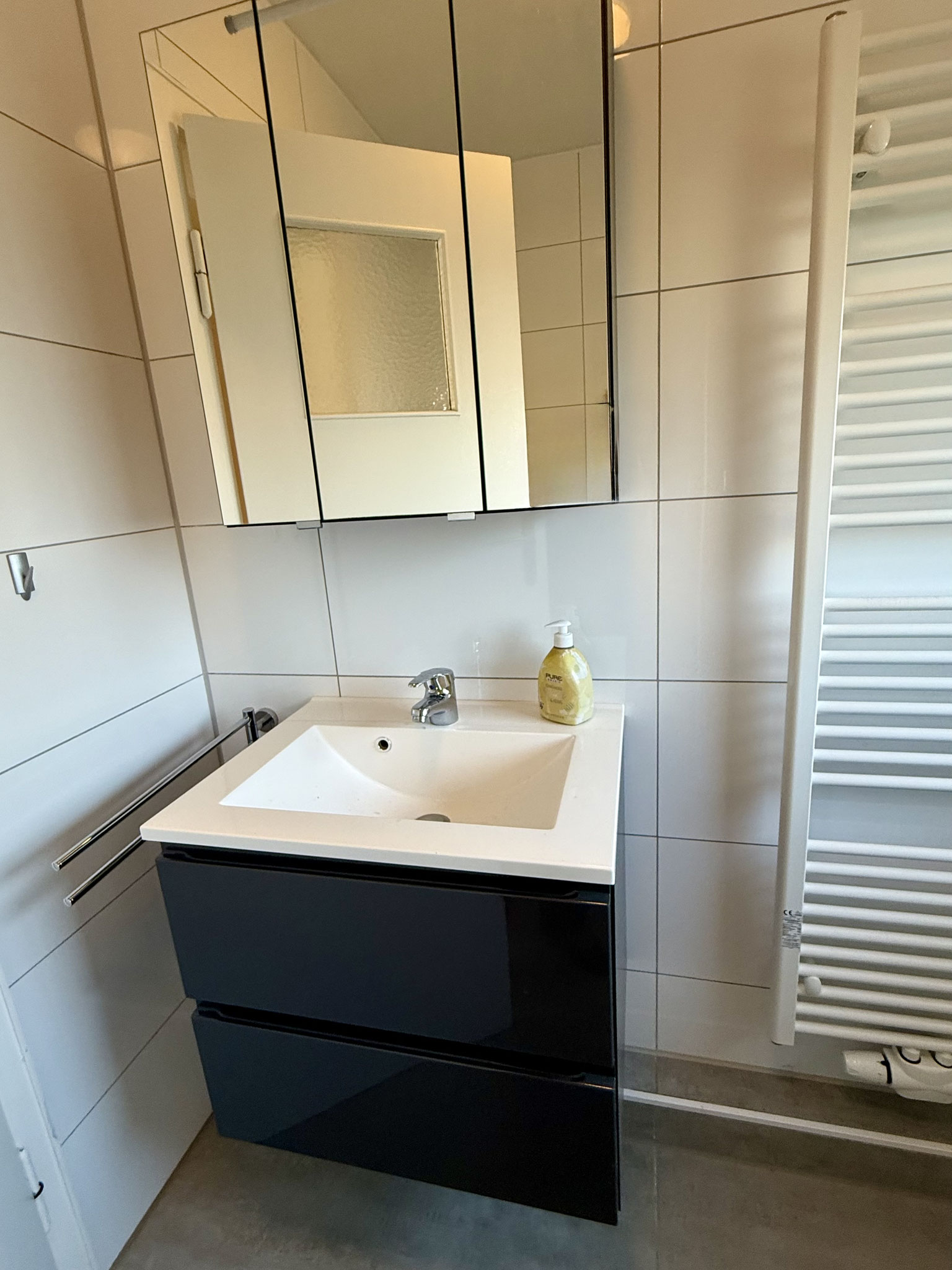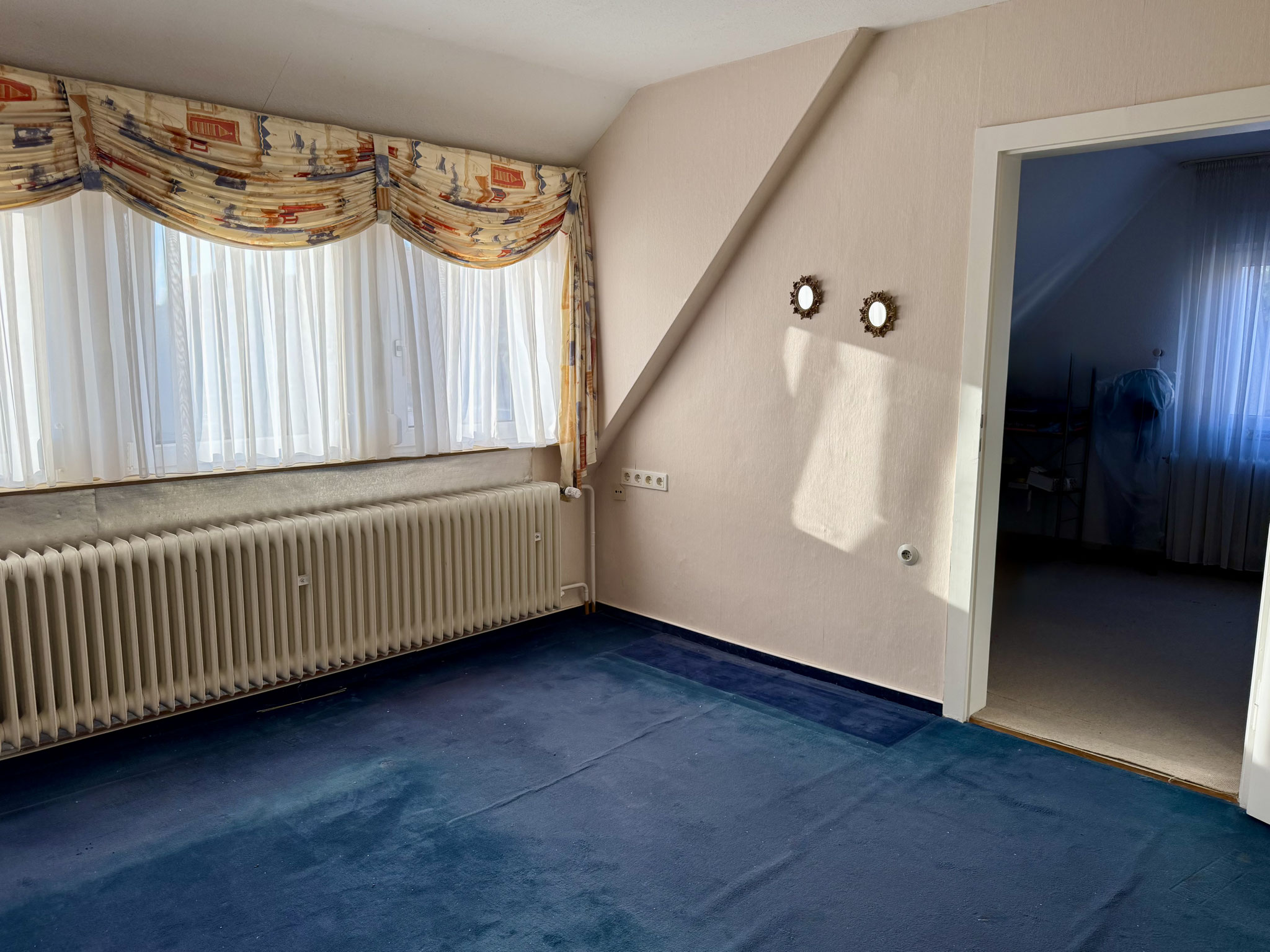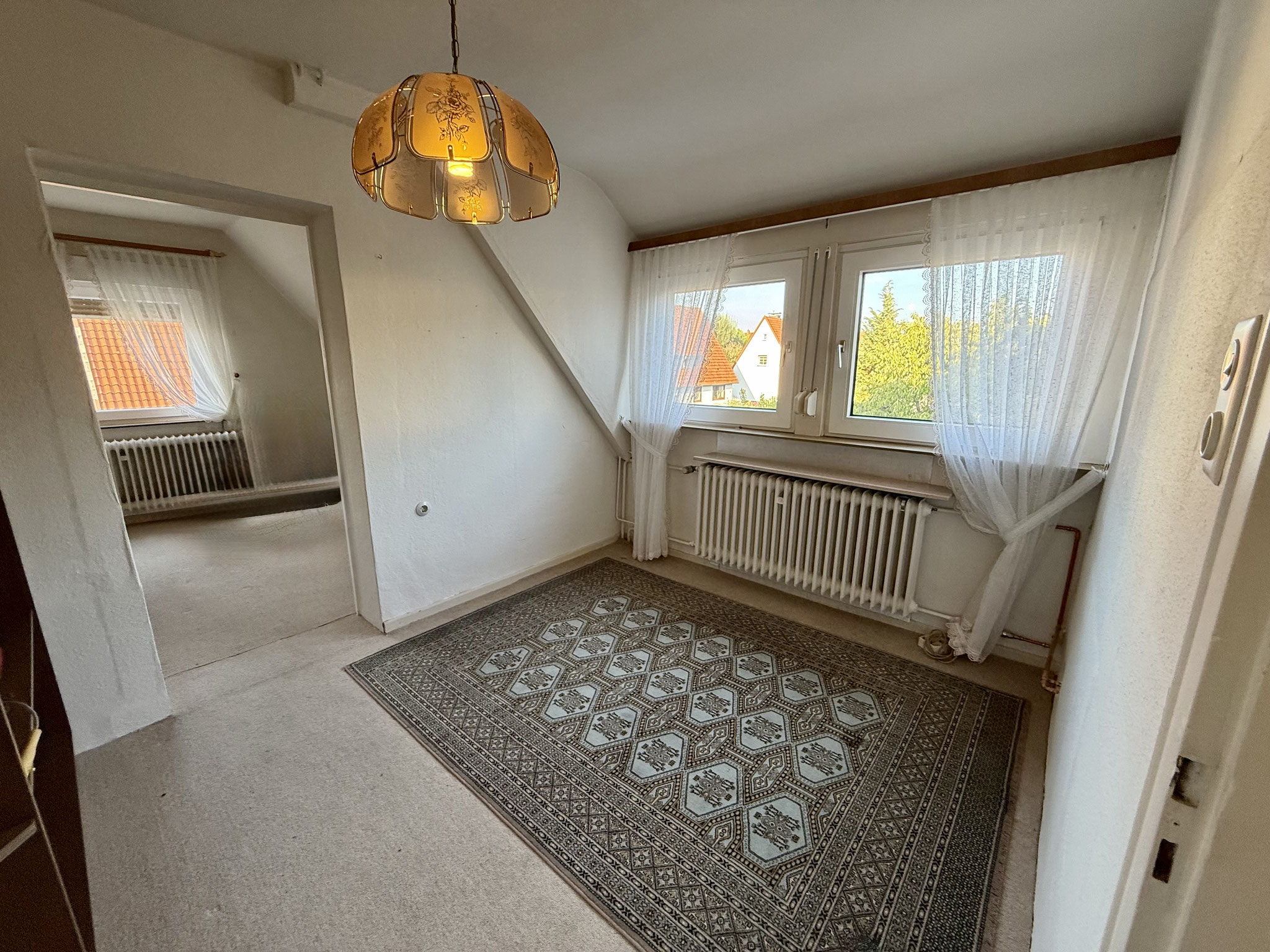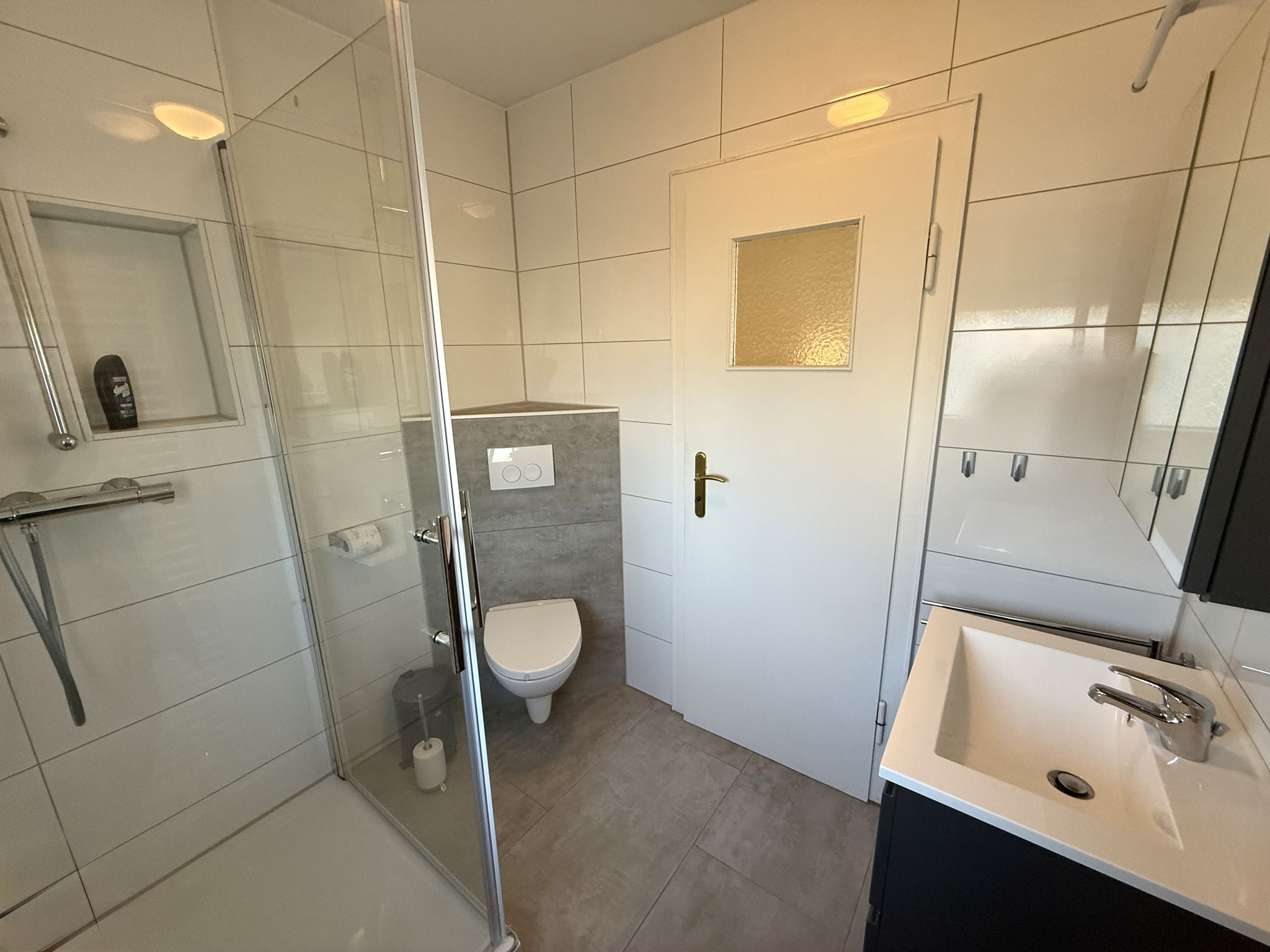 Über eine massive Treppe erschließt man das Obergeschoss. Das Obergeschoss bietet ein geschmackvolles Badezimmer mit barrierearmer Dusche. Ein zentraler Flur bietet Zugang zum Schlafzimmer mit schöner Fensterfront, einem Arbeitszimmer sowie zwei Kinderzimmern. Sämtliche Räume im Obergeschoss, bis auf das Badezimmer, sind durch Türen miteinander verbunden.